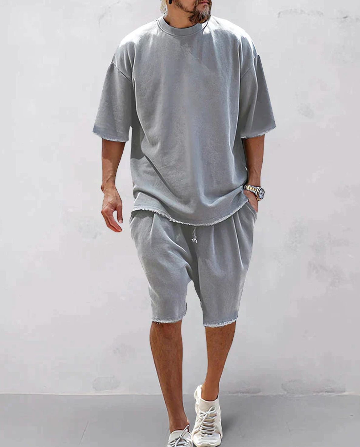 Dieses Baumwoll-Sommerset für Herren ist perfekt für warme Tage. Es besteht aus einem bequemen T-Shirt und modischen Shorts. Das aus hochwertiger Baumwolle gefertigte Set bietet ein leichtes und atmungsaktives Tragegefühl, das Sie den ganzen Sommer über kühl und modisch hält.