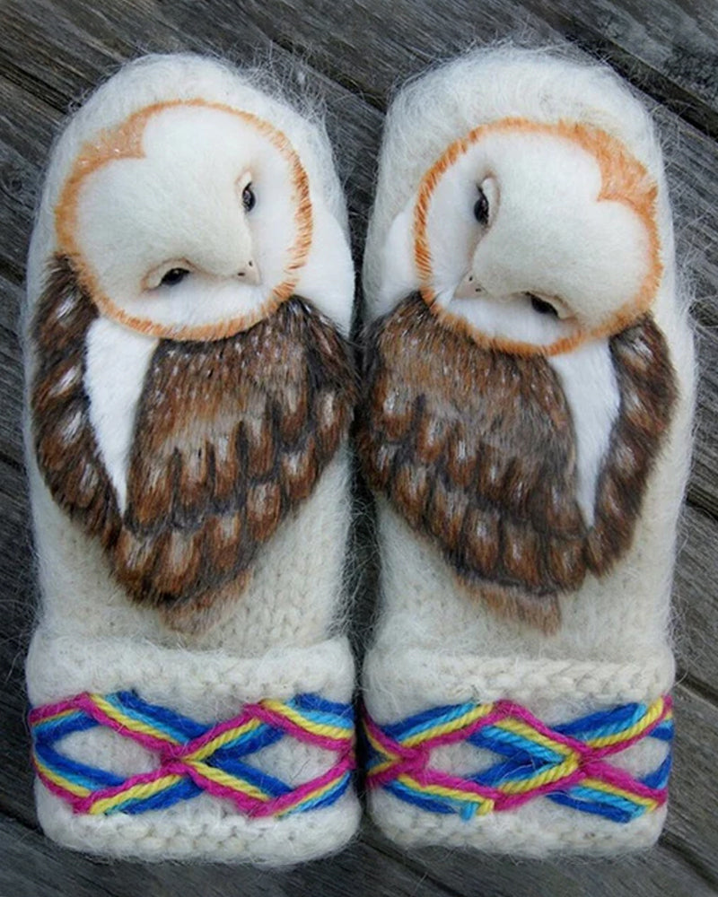 1 Paar handgefertigte Wollhandschuhe mit Eulen – skandinavisches Muster mit Eulen
